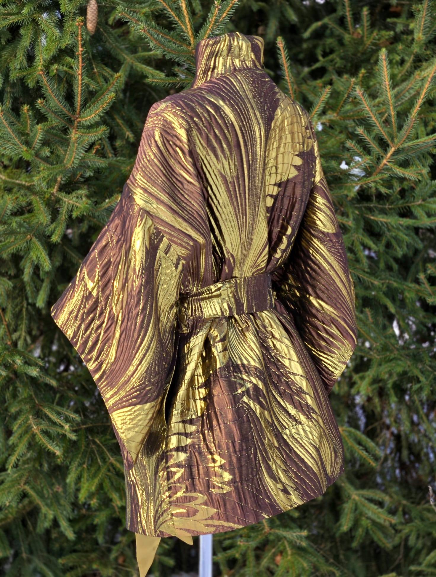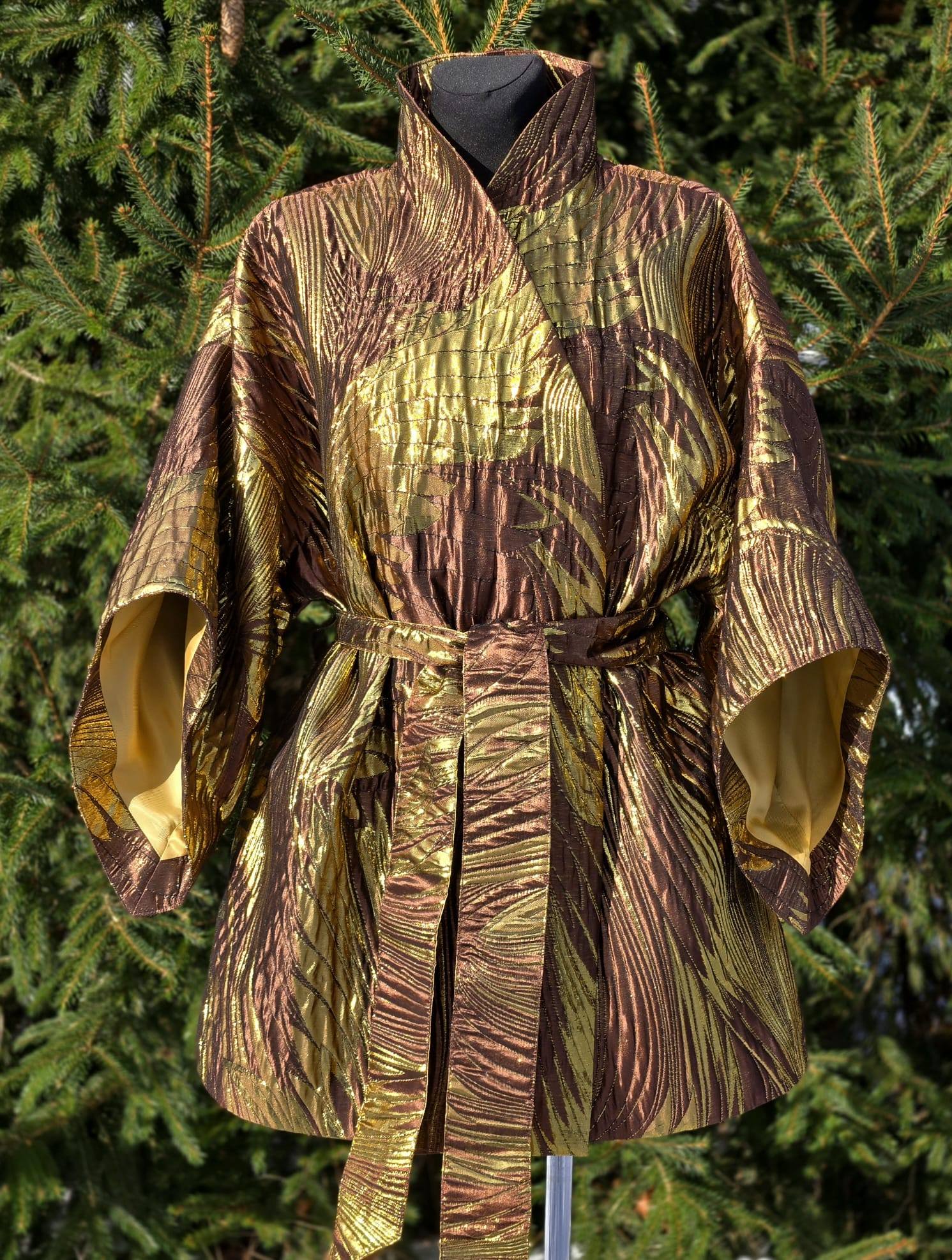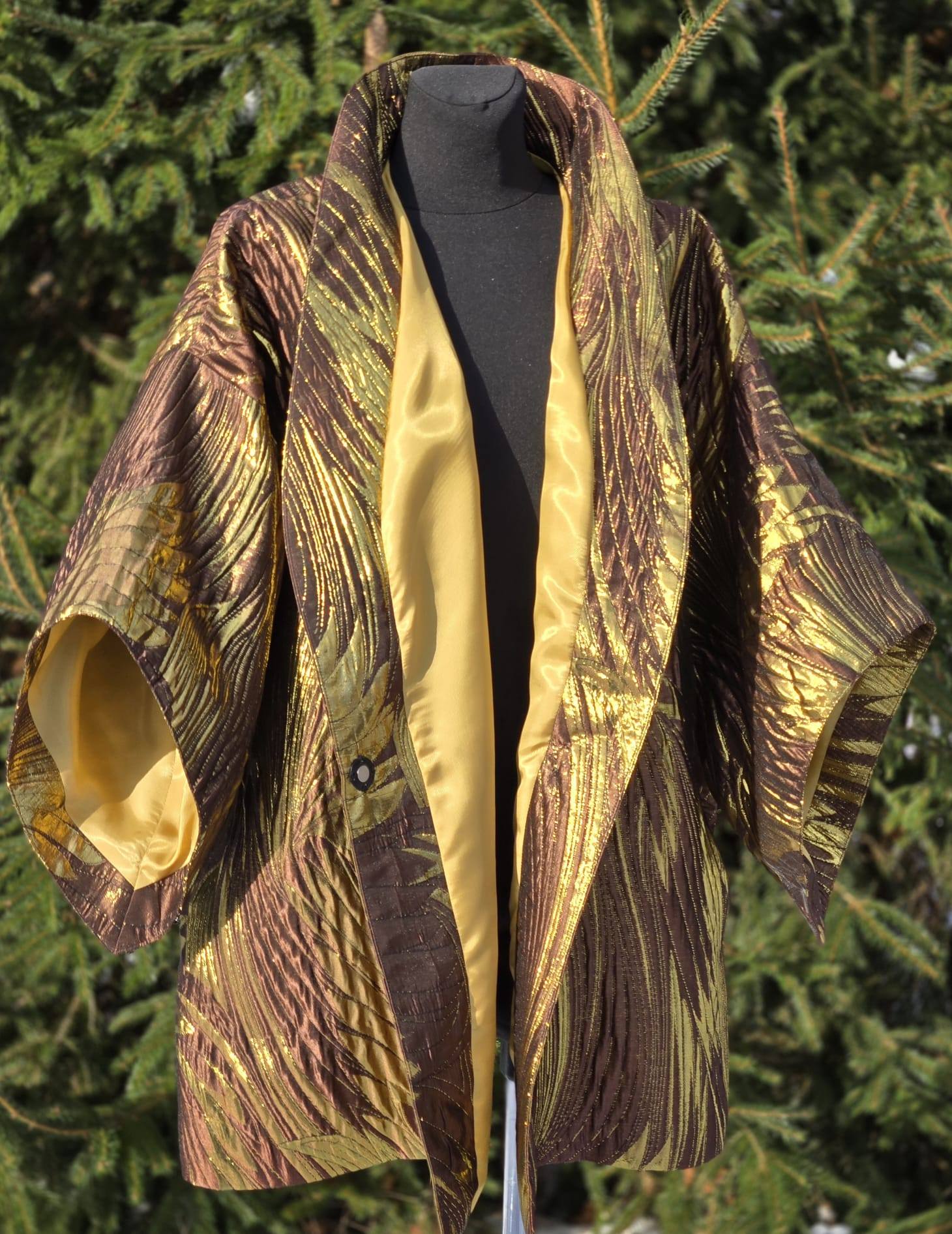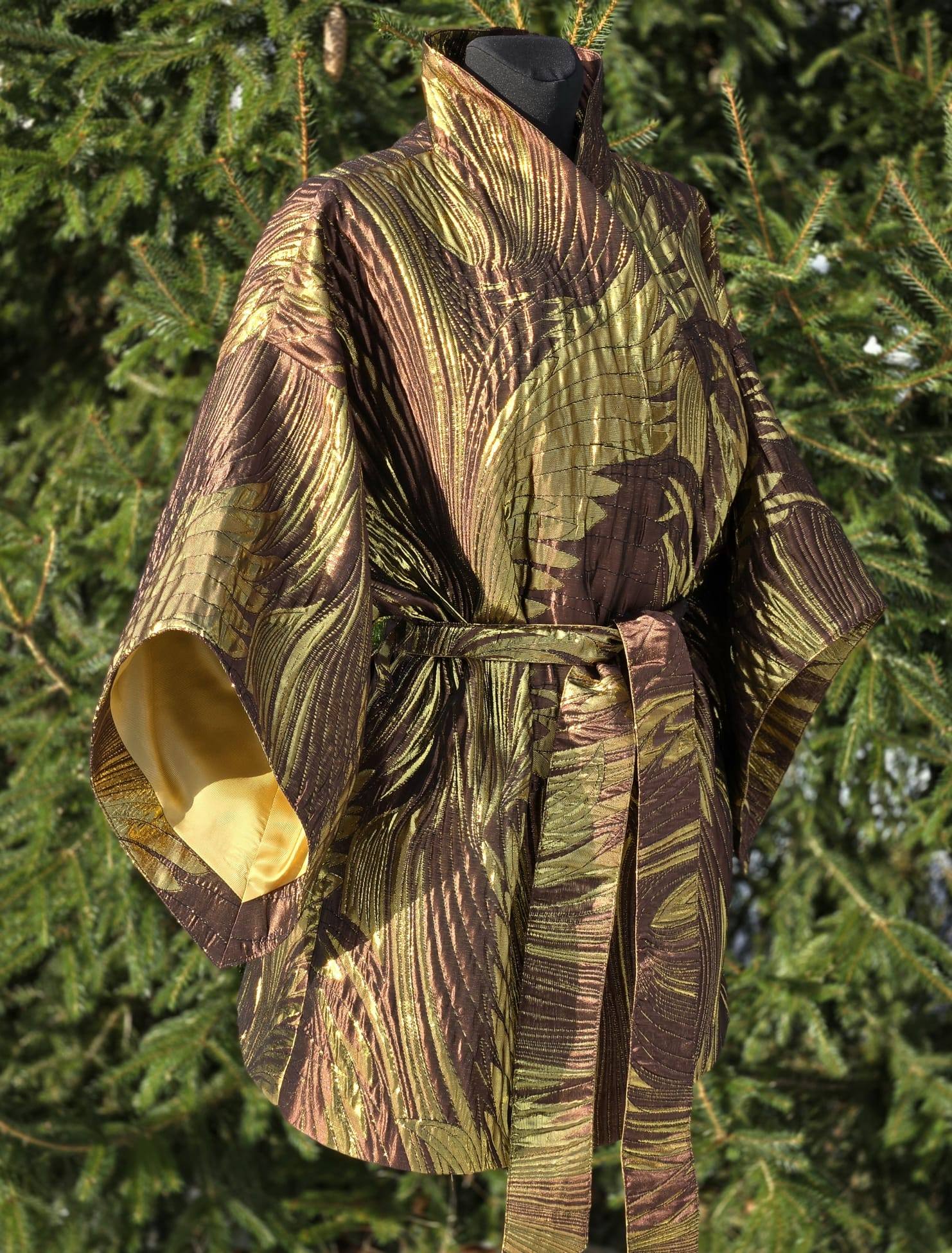 Selle KIMONO sisemust katab ilus kuldne/beež viskoosvooder (vis+pes segu). Põhikangaks on kõrgkvaliteetne brokaatkangas. Kanga valmistamiseks on kasutatud metallniite mis lisavad kangale sära ja kolmemõõtmelisuse.
